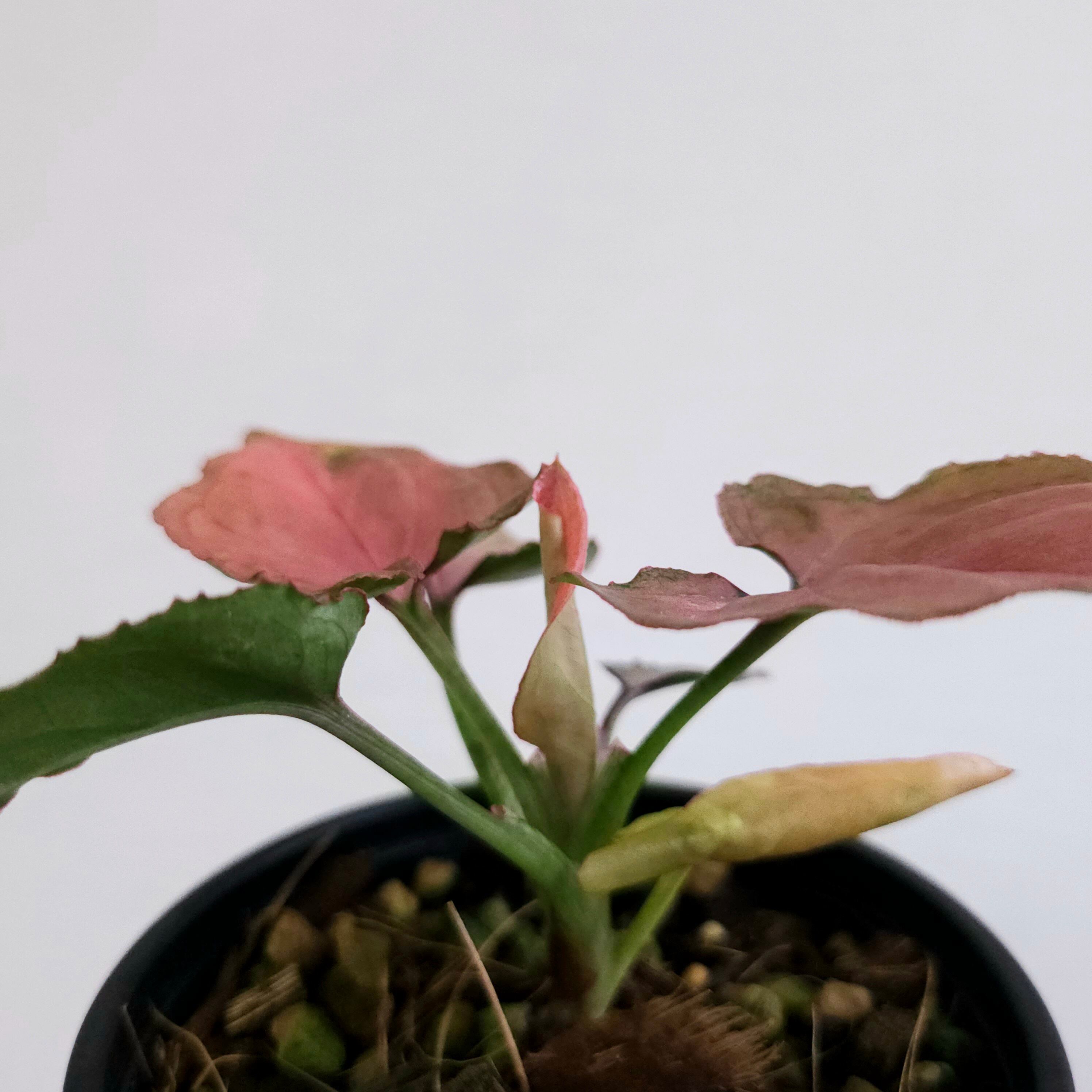 “完璧なピンク”を楽しめる特別なシンゴニウムです。やわらかなピンクからブロンズがかった色合いへと移ろう葉は、光の加減によって異なる表情を見せ、眺めるたびに新しい美しさを感じさせてくれます。成長とともに葉の形や色が少しずつ変化します。