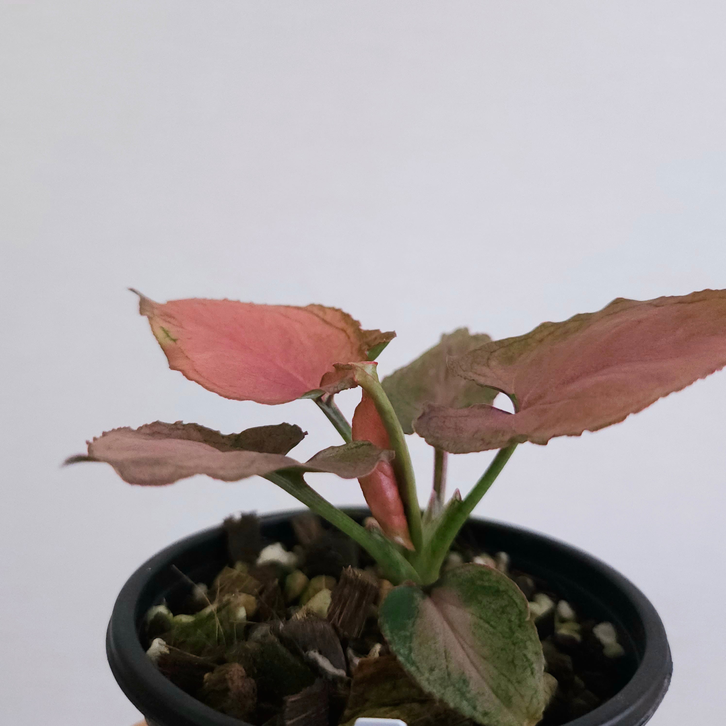 “完璧なピンク”を楽しめる特別なシンゴニウムです。やわらかなピンクからブロンズがかった色合いへと移ろう葉は、光の加減によって異なる表情を見せ、眺めるたびに新しい美しさを感じさせてくれます。成長とともに葉の形や色が少しずつ変化します。