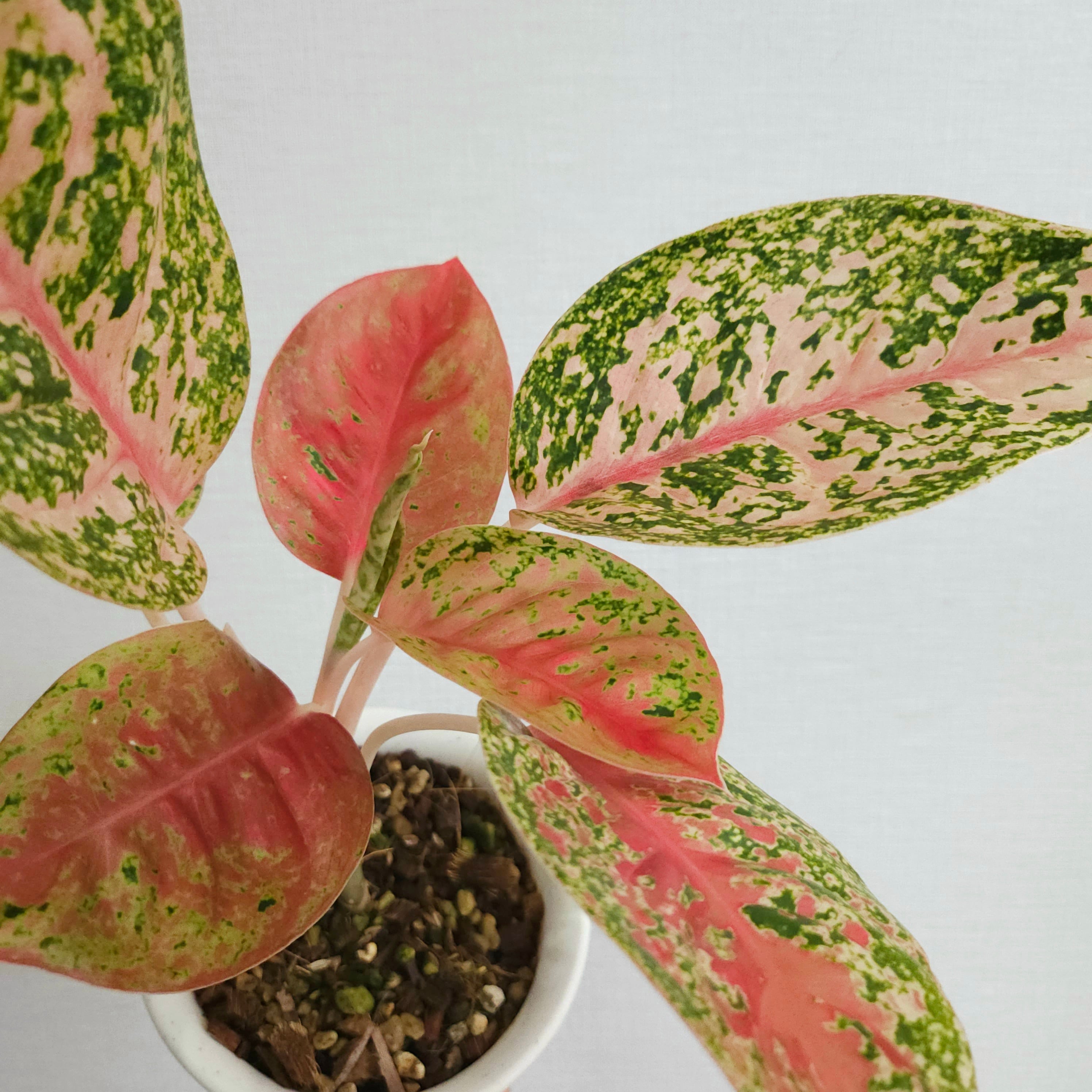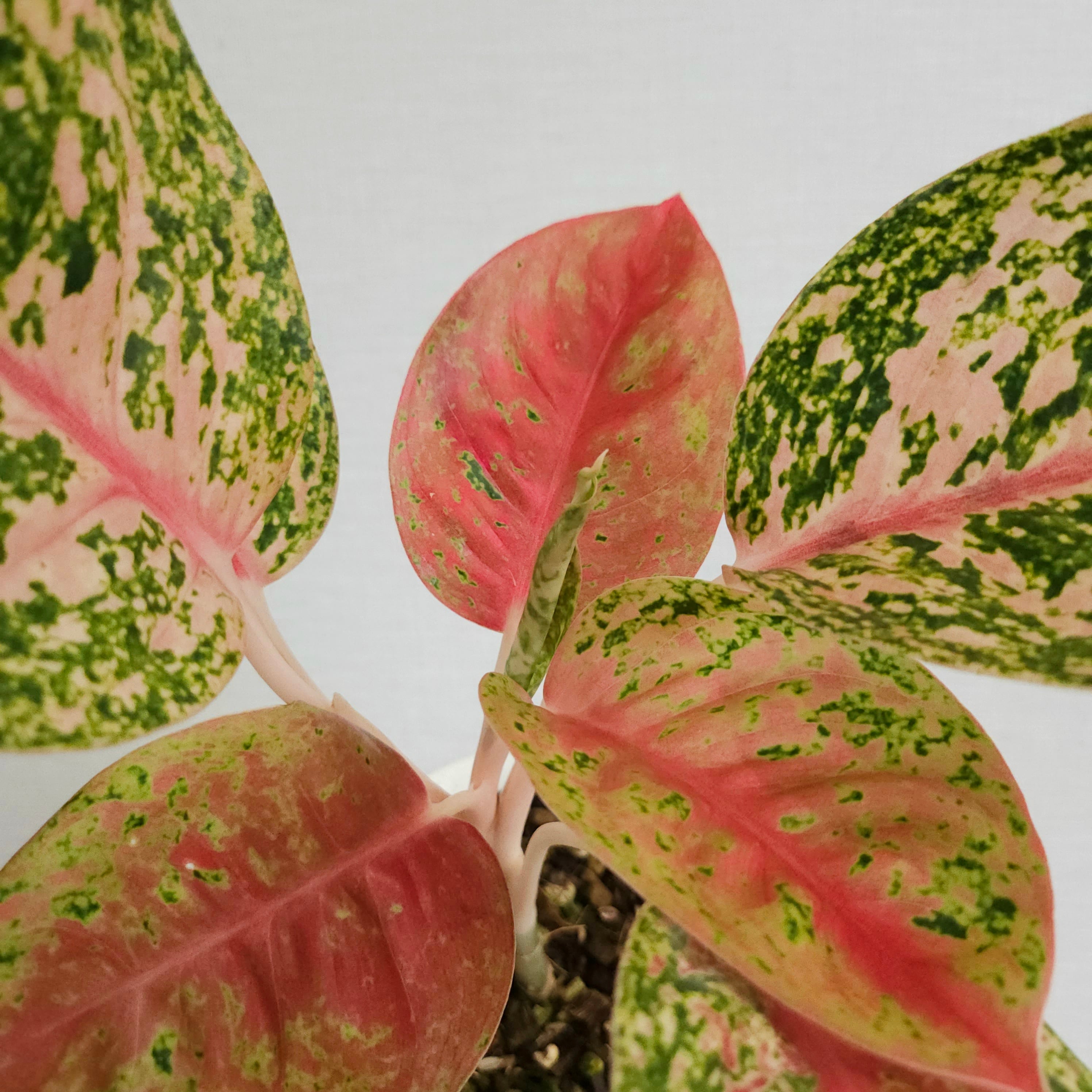 鮮やかなピンクレッドとグリーンのコントラストが美しい人気の品種です。華やかな葉模様は空間を一気に明るくし、インテリアとしても存在感を放ちます。タイでは“富と繁栄を呼ぶ縁起の良い植物”として親しまれており、贈り物にもおすすめです。