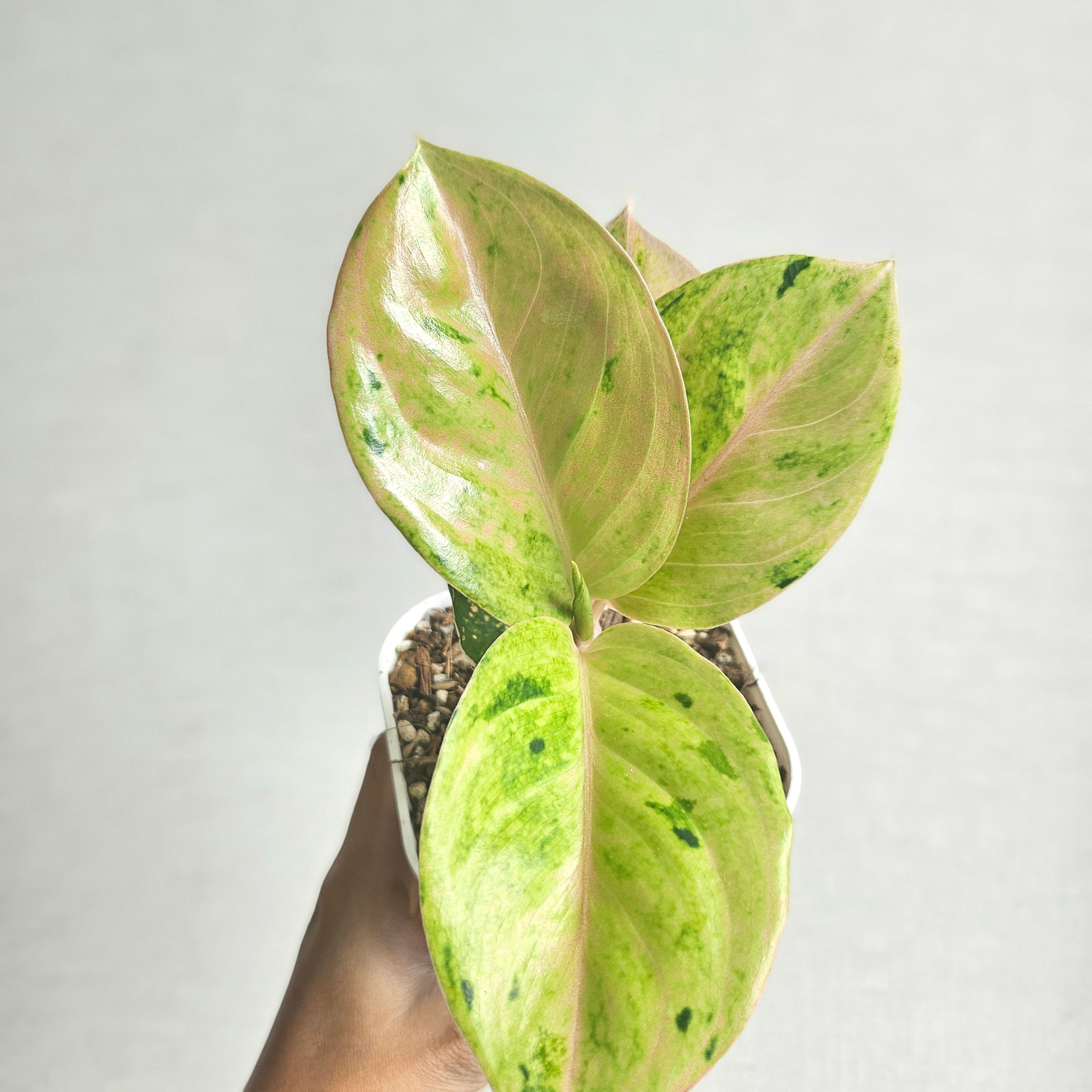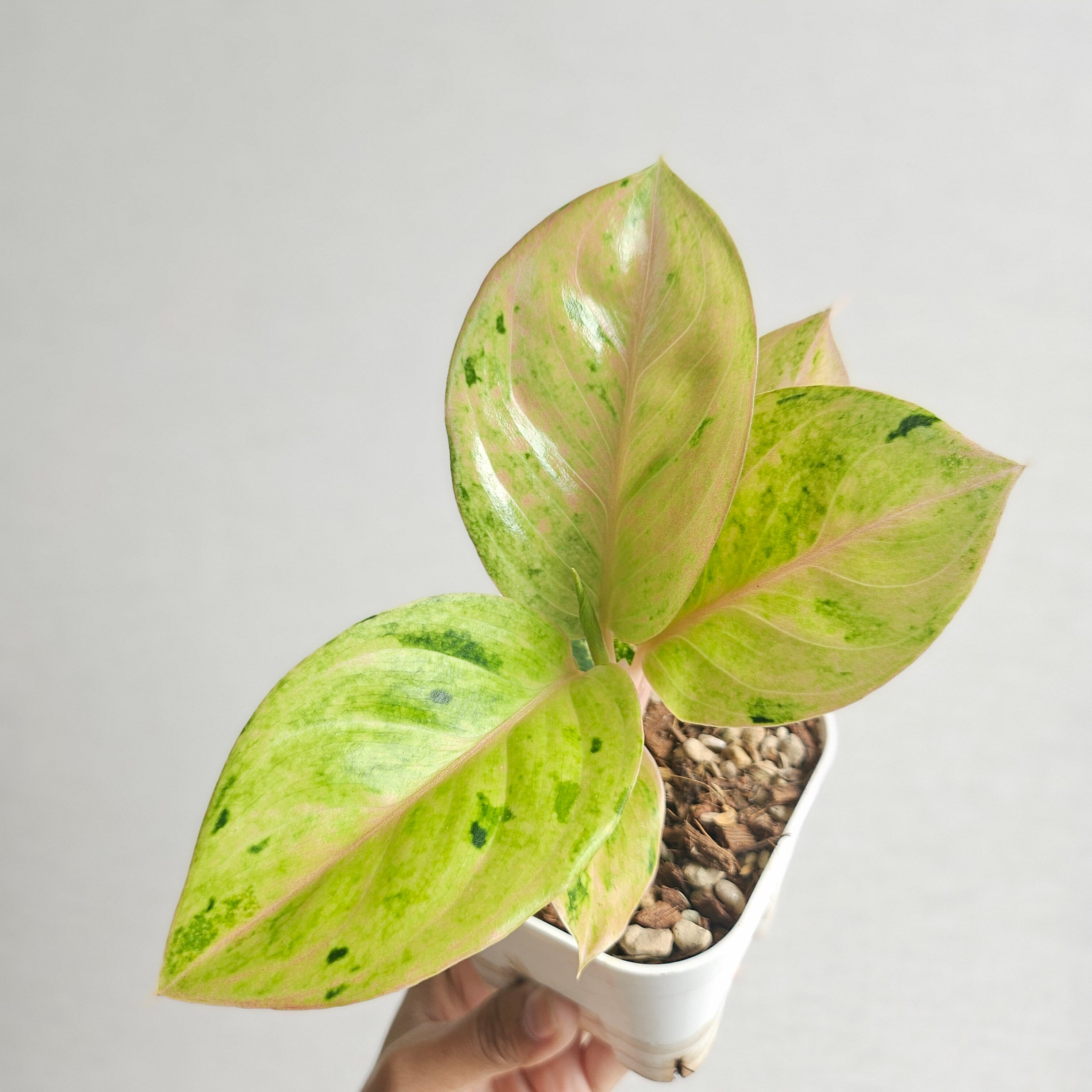 卵形の細長い葉に、明るい緑と濃い緑が美しく混ざり合い、中央や縁には黄金色や淡いピンクが差し込み、上品で華やかな印象を与えてくれます。