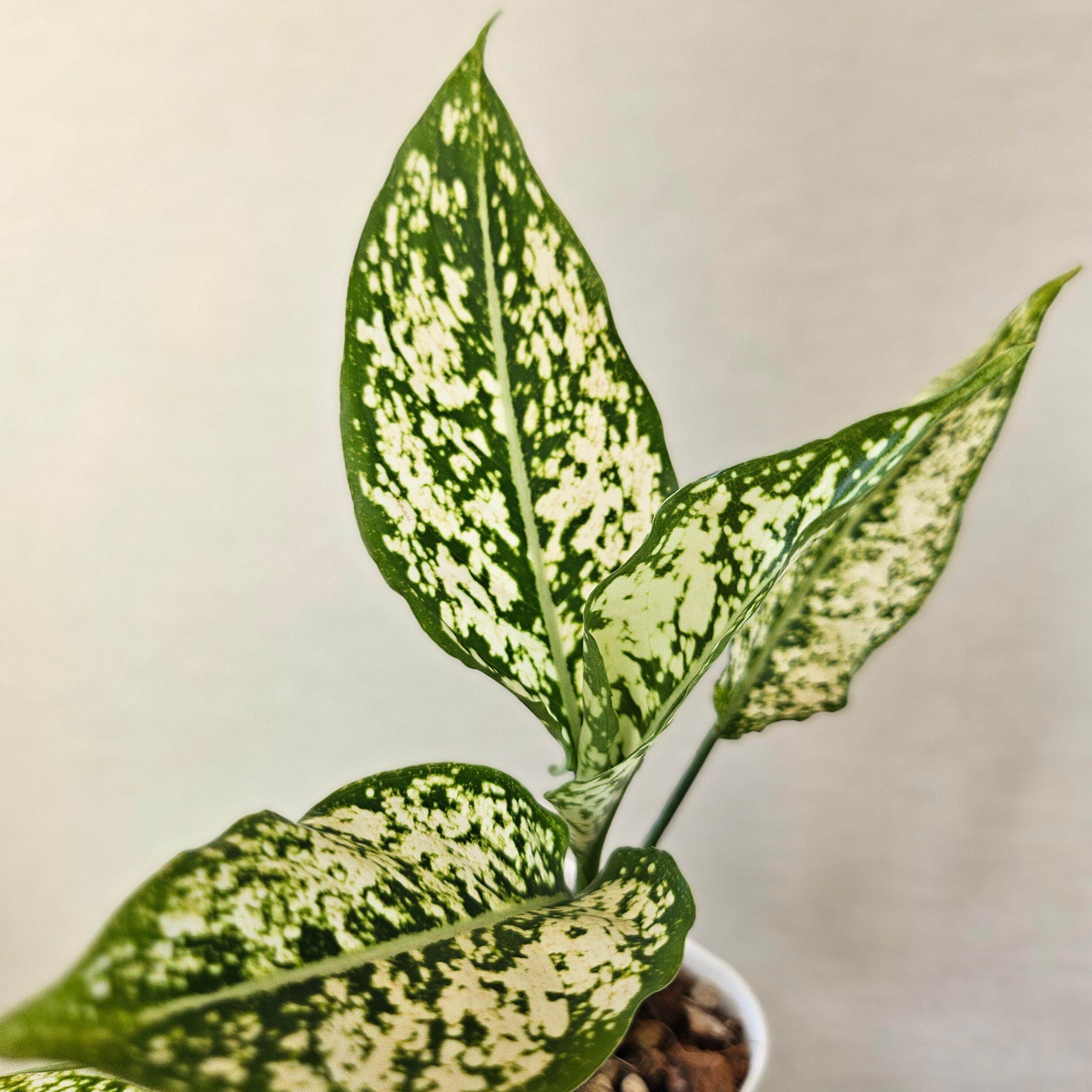 深い緑の葉に白い斑点模様が特徴的です。葉は細長く、光沢があり、上品で清涼感のある印象を与えます。斑の入り方がとても美しく、観葉植物コレクターにも人気があります。